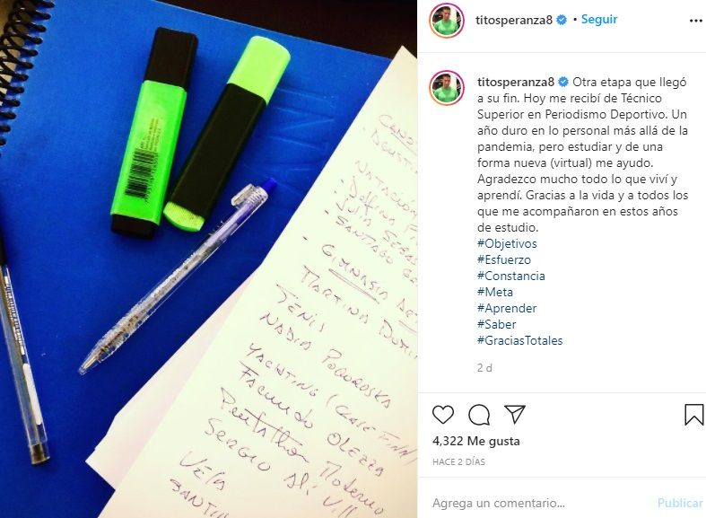 "Otra etapa que llegó a su fin. Hoy me recibí de Técnico Superior en Periodismo Deportivo", indicó en su posteo.