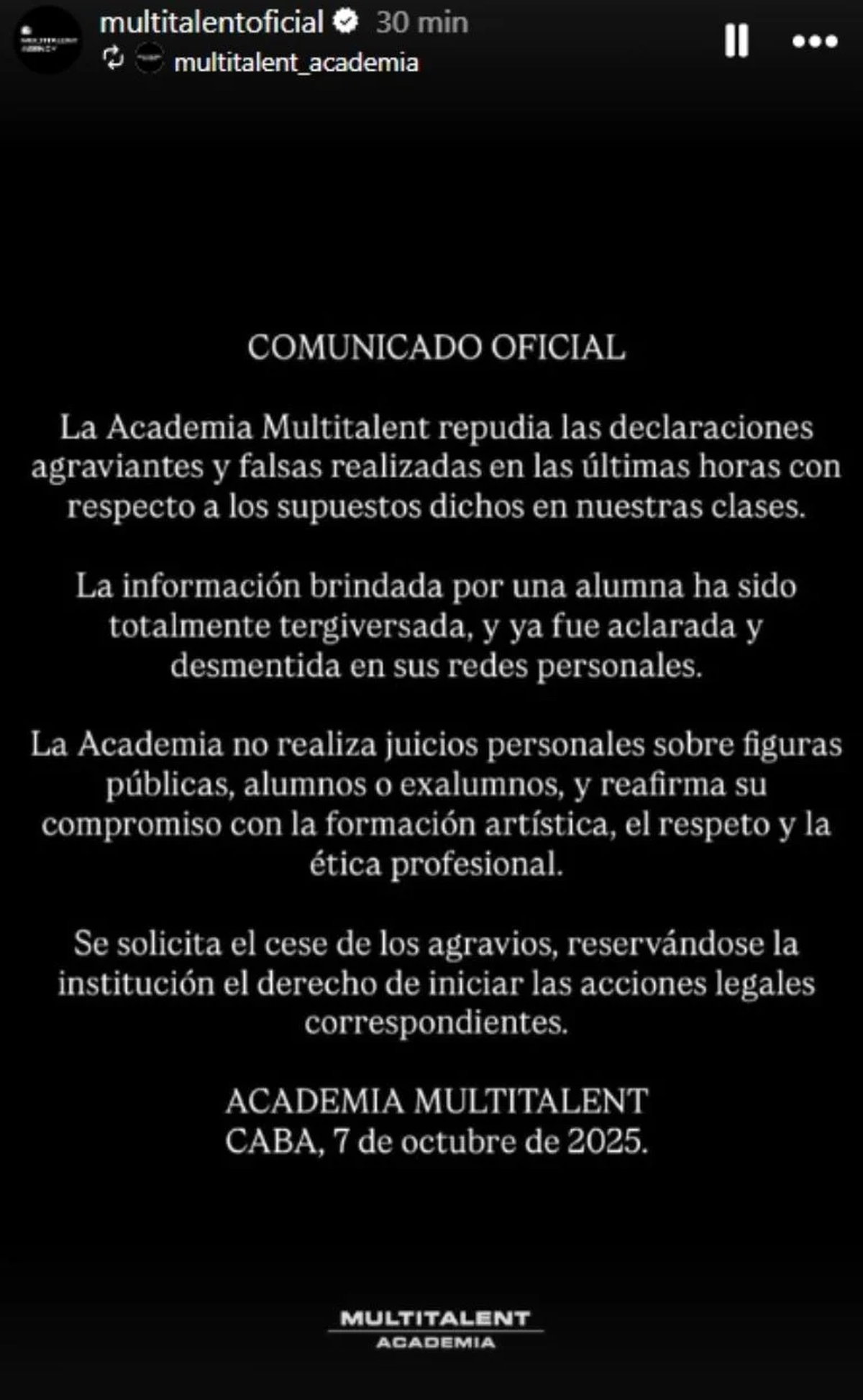 Sin embargo, después de la repercusión y de recibir llamados de atención, la ex GH utilizó sus redes sociales para aclarar lo ocurrido. “Necesito salir a aclarar una situación. Yo estoy haciendo un curso en una Academia muy importante en la que estoy muy agradecida. La información es errónea, no es algo que yo quise decir, se tergiversó. Fue algo que dijo una compañera en una de las clases y quiero sacar al profesor, que en uno de los programas lo nombraron”, escribió en su cuenta, intentando ponerle fin a la polémica.