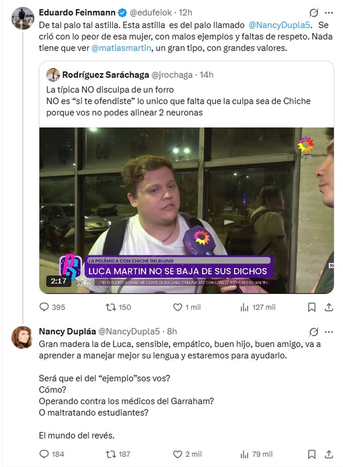 Lo cierto es que el tema no quedó ahí sino que después tras ver una entrevista al joven intento explicar el sentido de sus palabras sobre Chiche Gelblung, Feinmann arremetió directamente contra Nancy Dupláa, madre de Luca Martin.