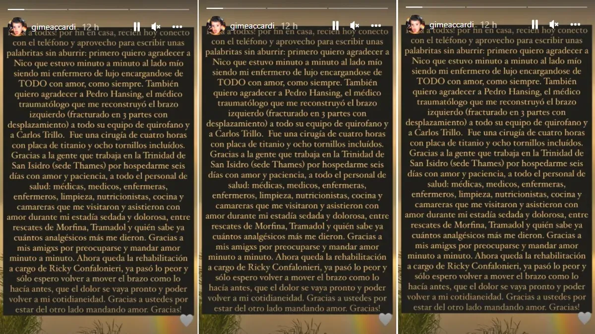 Y detalló: “Primero, quiero agradecer a Nico que estuvo minuto a minuto al lado mío, siendo mi enfermero de lujo encargándose de todo con amor, como siempre”. Además, también le dedicó sentidas palabras a los médicos que la atendieron: “También quiero agradecer a Pedro Hansing, el medico traumatólogo que me reconstruyó el brazo izquierdo (fracturado en tres partes con desplazamiento), a todo su equipo de quirófano y a Carlos Trillo”.