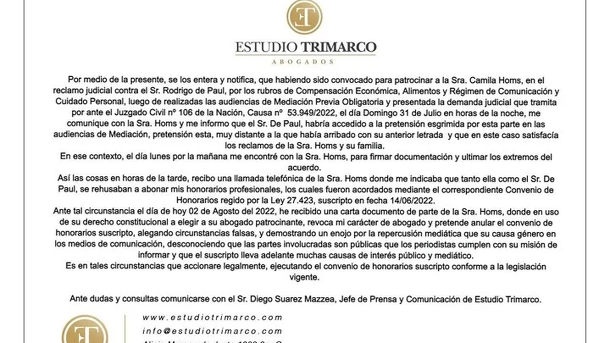 "En ese contexto, el día lunes por la mañana me encontré con la Sra. Homs para firmar documentación y ultimar los extremos del acuerdo. Así las cosas, en horas de la tarde, recibo una llamada telefónica de la Sra. Homs donde me indicaba que, tanto ella como el Sr. De Paul, se rehusaban a abonar mis honorarios profesionales, los cuales fueron acordados mediante el correspondiente Convenio de Honorarios regido por la Ley 27.423, suscripto en fecha 14/06/2022", agrega el comunicado.