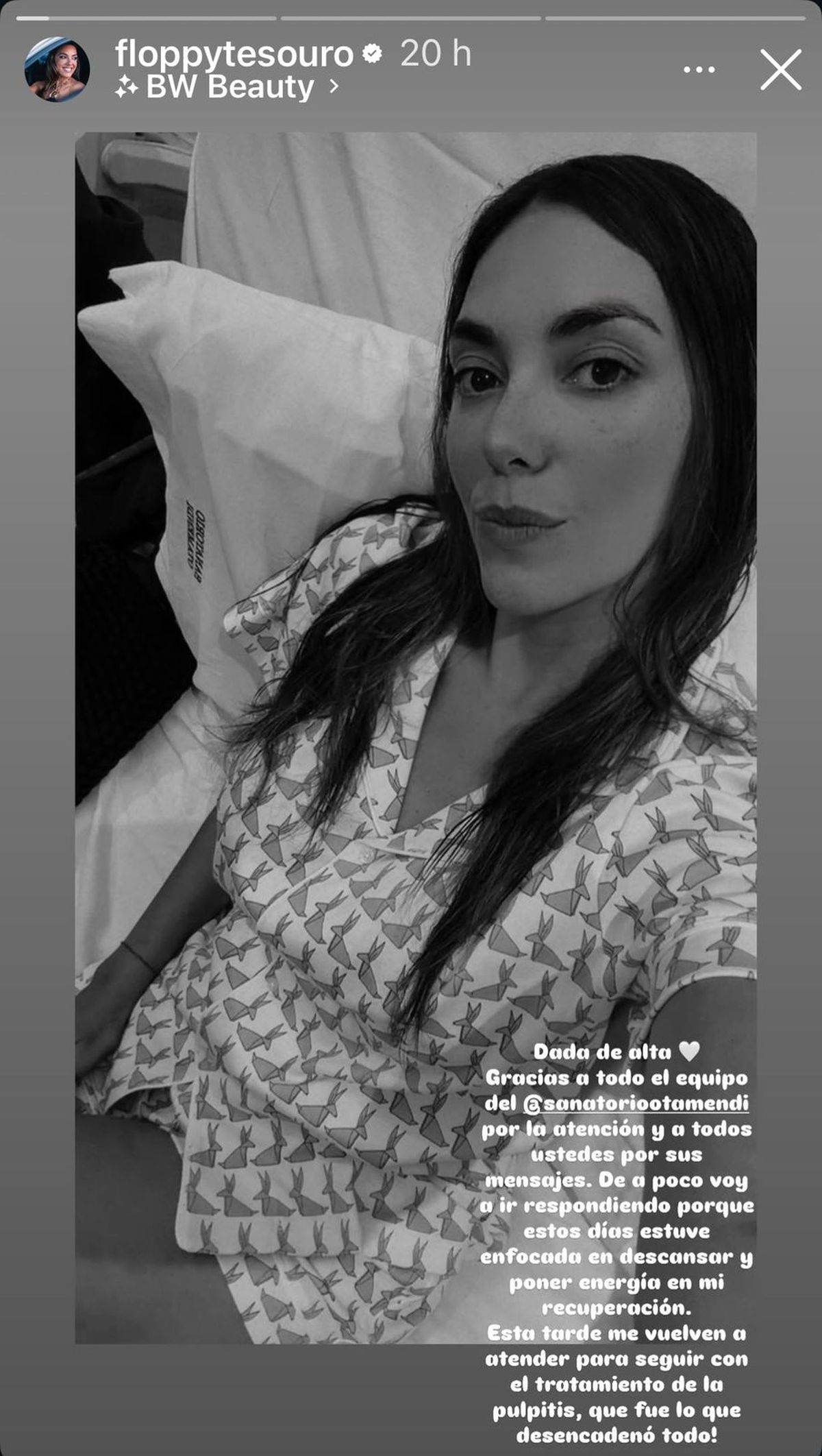 Más tarde, ya después de haber pasado por una intervención vinculada a esta afección, la modelo volvió a mostrarse en redes con un mensaje sincero sobre lo vivido. "Ya salí de la intervención por la pulpitis. Muy duro todo lo que estoy pasando... el último tramo llorando, pero con un médico que trabajó con muchísima paciencia y lo logramos", relató, sin ocultar la angustia del momento.
