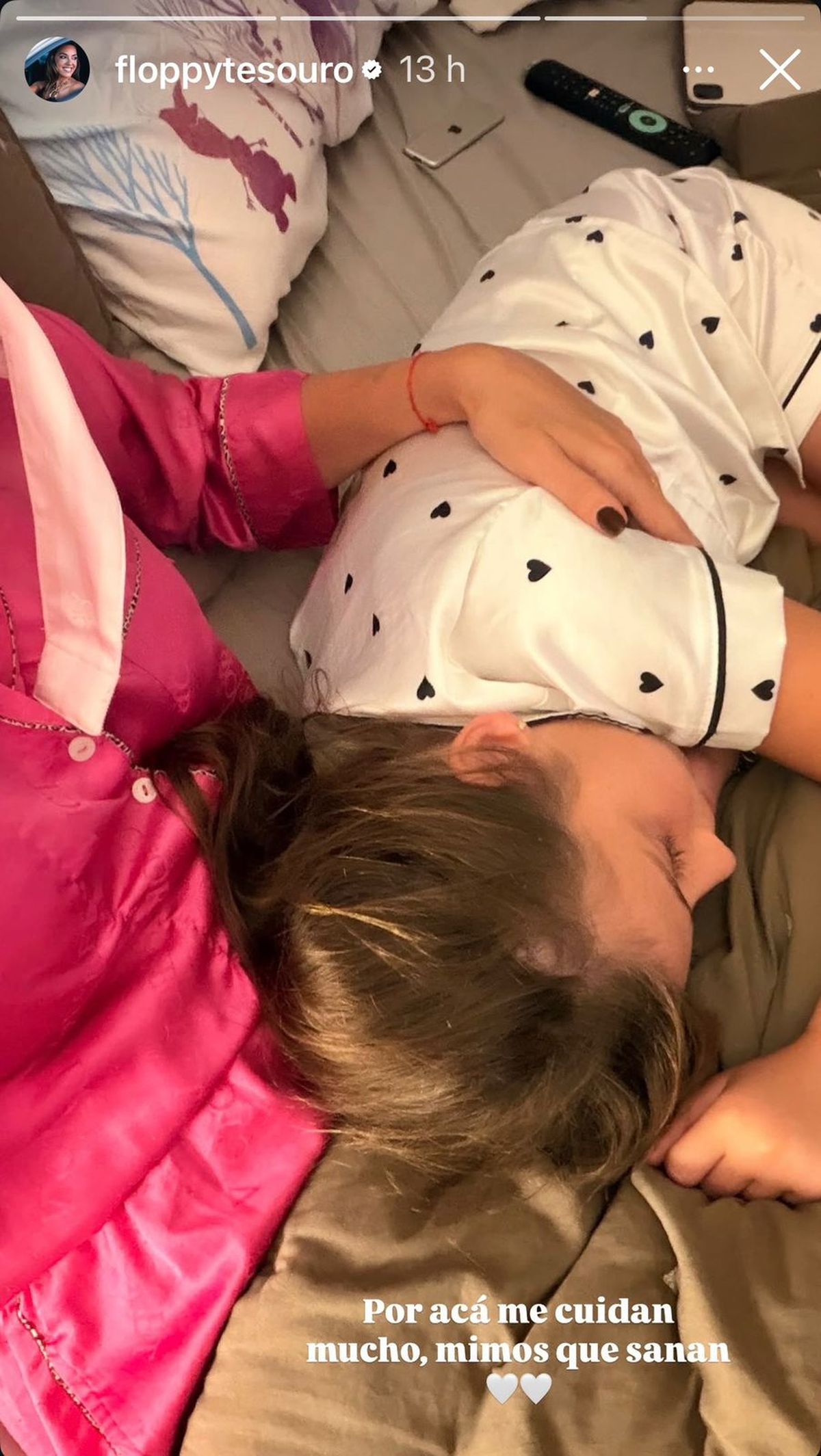 Ya de regreso en su casa, acompañada por su pareja y su hija, Floppy Tesouro también compartió un tierno momento familiar que reflejó el sostén emocional en este contexto. En una imagen junto a la pequeña Moorea, escribió: "Por acá me cuidan muchos, mimos que sanan".