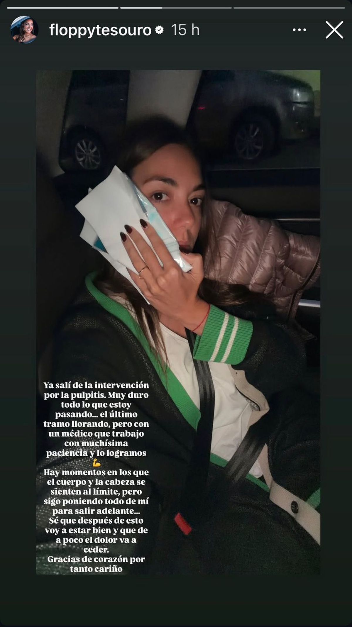 En ese mismo contexto, Floppy Tesouro brindó detalles sobre el cuadro que derivó en su internación. Según explicó, todo se desencadenó por una pulpitis, una inflamación dental que provoca un dolor intenso y que requiere un tratamiento específico. "Esta tarde me vuelven a atender para seguir con el tratamiento de la pulpitis, que fue lo que me desencadenó todo", reveló.