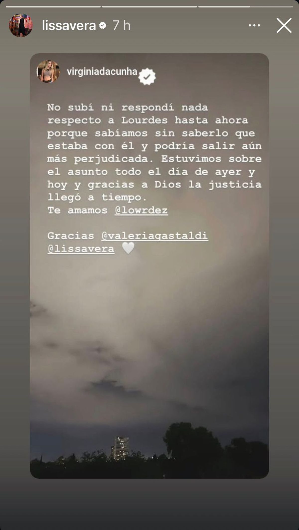 Por su parte, Lissa Vera no dudó en repostear la historia virtual de Virginia luego de un día cargado de angustia y desesperación, en el que tomó la decisión de radicar su denuncia contra García Gómez y haber declarado públicamente que lo único que pretendía era ayudar a su amiga. Así como también aseguró que prefería a su amiga "enojada y viva, antes que feliz y muerta".