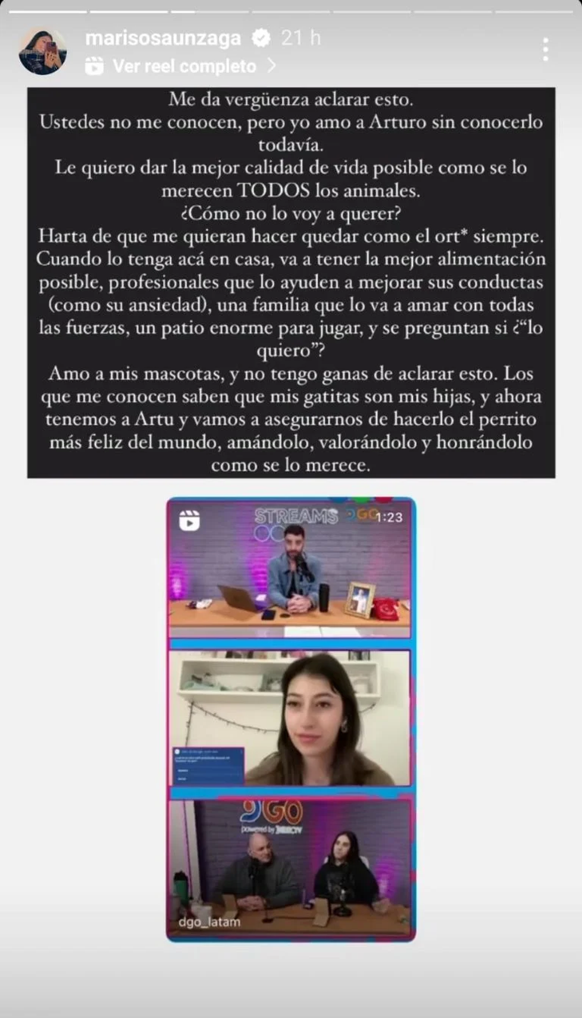 Después de sus dichos, la novia de Martín recibió duras críticas por parte de algunos fans en las redes. Por esa razón, la joven se vio obligada a publicar un descargo: “Me da vergüenza aclarar esto. Ustedes no me conocen pero yo amo a Arturo sin conocerlo todavía. Le quiero dar la mejor calidad de vida posible como se lo merecen todos los animales. ¿Cómo no lo voy a querer?”.
