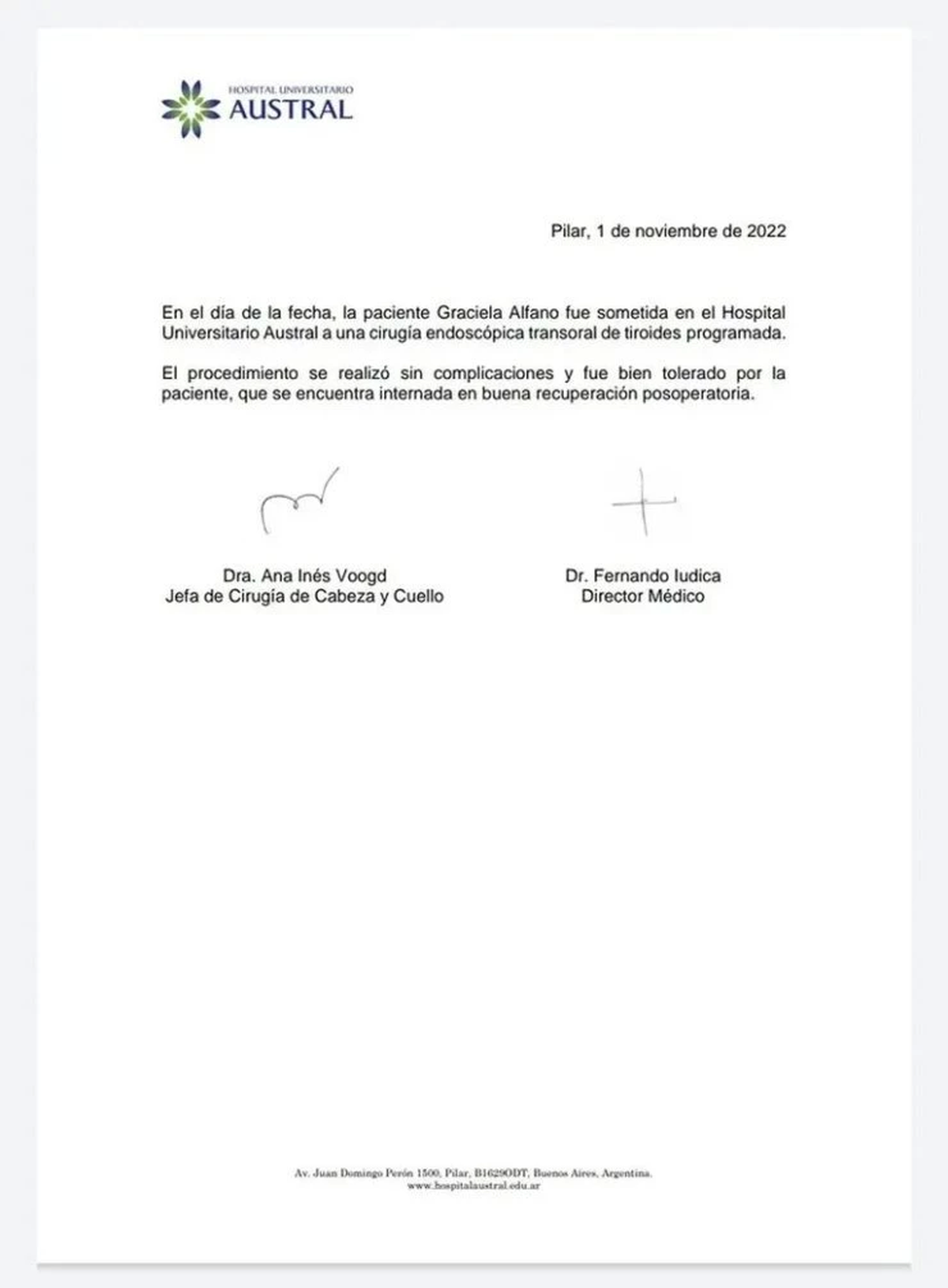 Minutos después, PrimiciasYa recibió en exclusivo el parte medico de Alfano donde se detalla que "En el día de la fecha, la paciente Graciela Alfano fue sometida en el Hospital Universitario Austral a una cirugía laparoscópica renal programada".