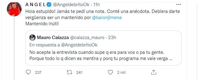 A lo que Ángel, al leer esto, explotó: "Hola estúpido! Jamás te pedí una nota. Conté una anécdota. Debiera darte vergüenza ser un mantenido por @baronjimena Mantenido inútil".