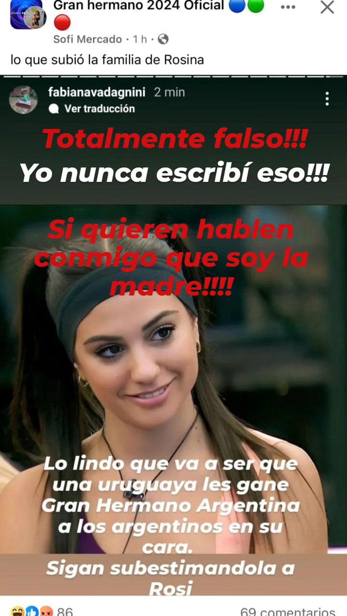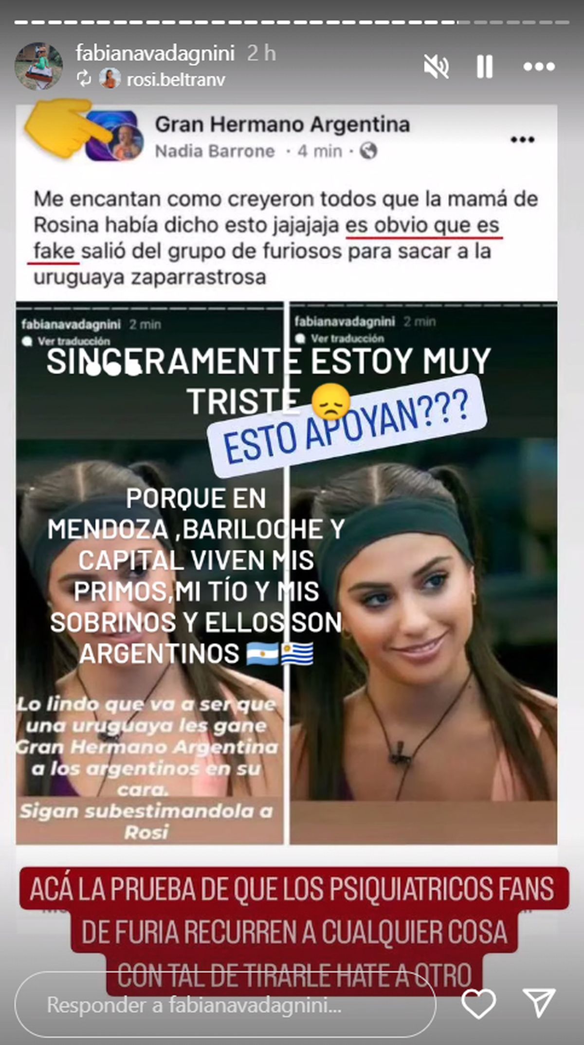 Todo comenzó cuando en las redes sociales se viralizó una historia de Instagram supuestamente escrita por la mamá de Rosina que decía: "Lo lindo que va a ser que una uruguaya les gane Gran Hermano Argentina en su cara. Sigan subestimándola a Rosi".