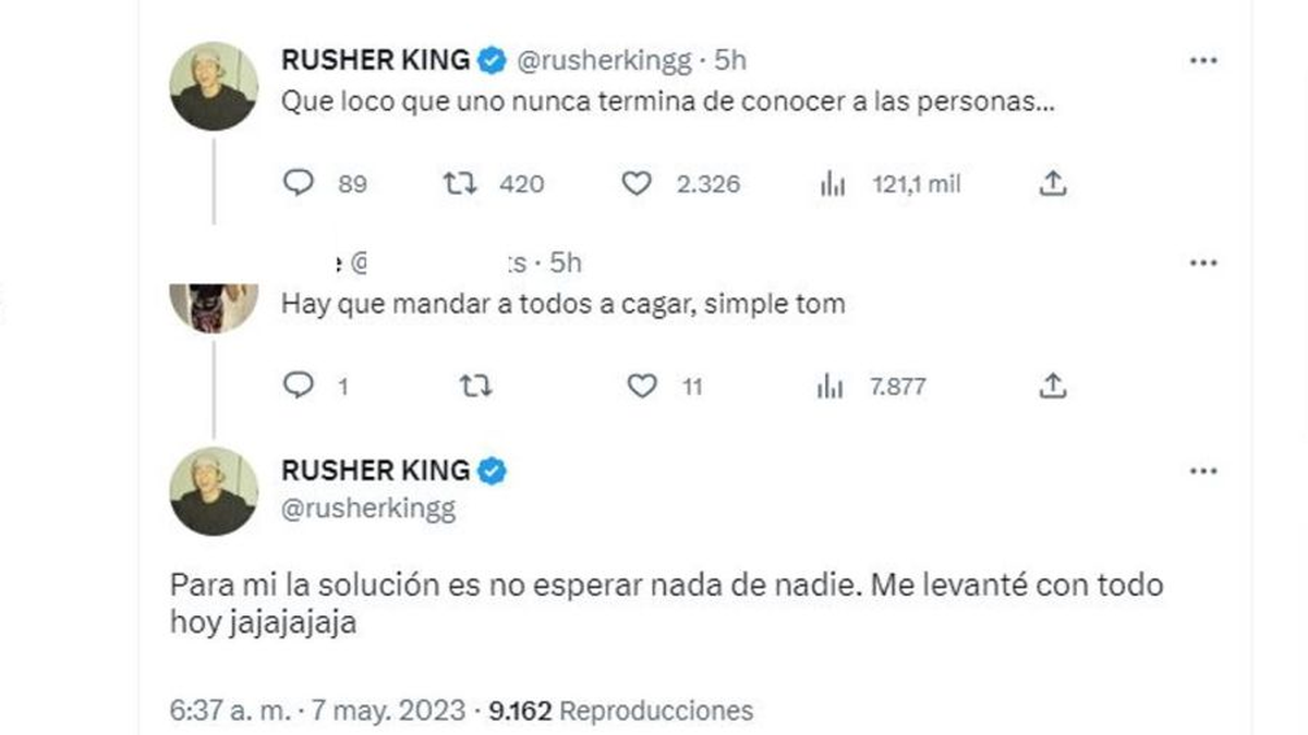 "Que loco que uno nunca termina de conocer a las personas...", fue el primer mensaje que Rusherking publicó. "Hay que mandar a todos a cagar, simple Tom", le comentó una seguidora, a lo que el cantante respondió: "Para mí, la solución es no esperar nada de nadie. Me levanté con todo hoy jajajajaja".