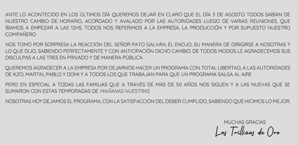 Y apuntaron: "Nos tomó por sorpresa la reacción del señor Pato Galván, el enojo, su manera de dirigirse a nosotras y lo que dijo, sabiendo perfectamente y con anticipación dicho cambio. De todos modos le agradecemos sus disculpas a las tres en privado y de manera pública".