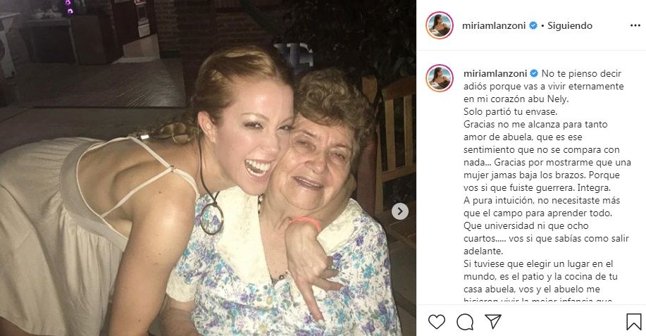 Es un día de muchísima tristeza para Miriam Lanzoni y su familia por la muerte de su abuela, Nely. La actriz compartió con sus seguidores el doloroso momento que vive y le dedicó palabras de amor para despedirla.