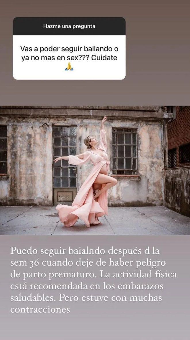 Y luego explicó: "Puedo seguir bailando después de la semana 36 cuando deje de haber peligro de parto prematuro. La actividad física está recomendada en los embarazos saludables. Pero estuve con muchas contracciones".