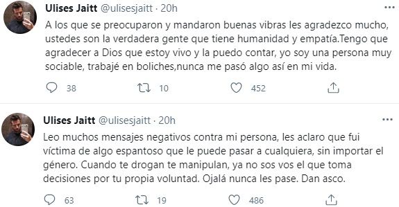 "Leo muchos mensajes negativos contra mi persona, les aclaro que fui víctima de algo espantoso que le puede pasar a cualquiera, sin importar el género. Cuando te drogan te manipulan, ya no sos vos el que toma decisiones por tu propia voluntad. Ojalá nunca les pase. Dan asco", precisó.