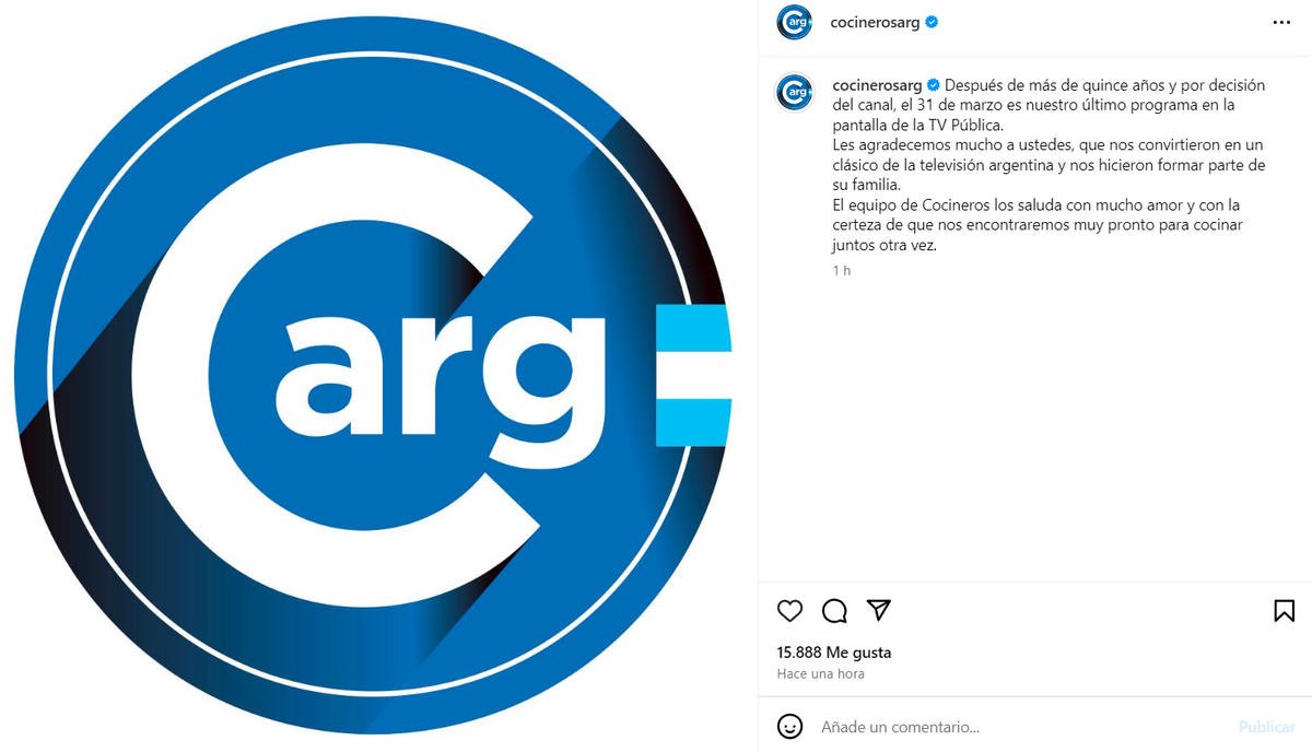 Este miércoles desde su cuenta oficial de Instagram el histórico programa de la TV Pública, Cocineros Argentinos, anunció que fue levantado del aire y se despedirá de la pantalla a finales de marzo.