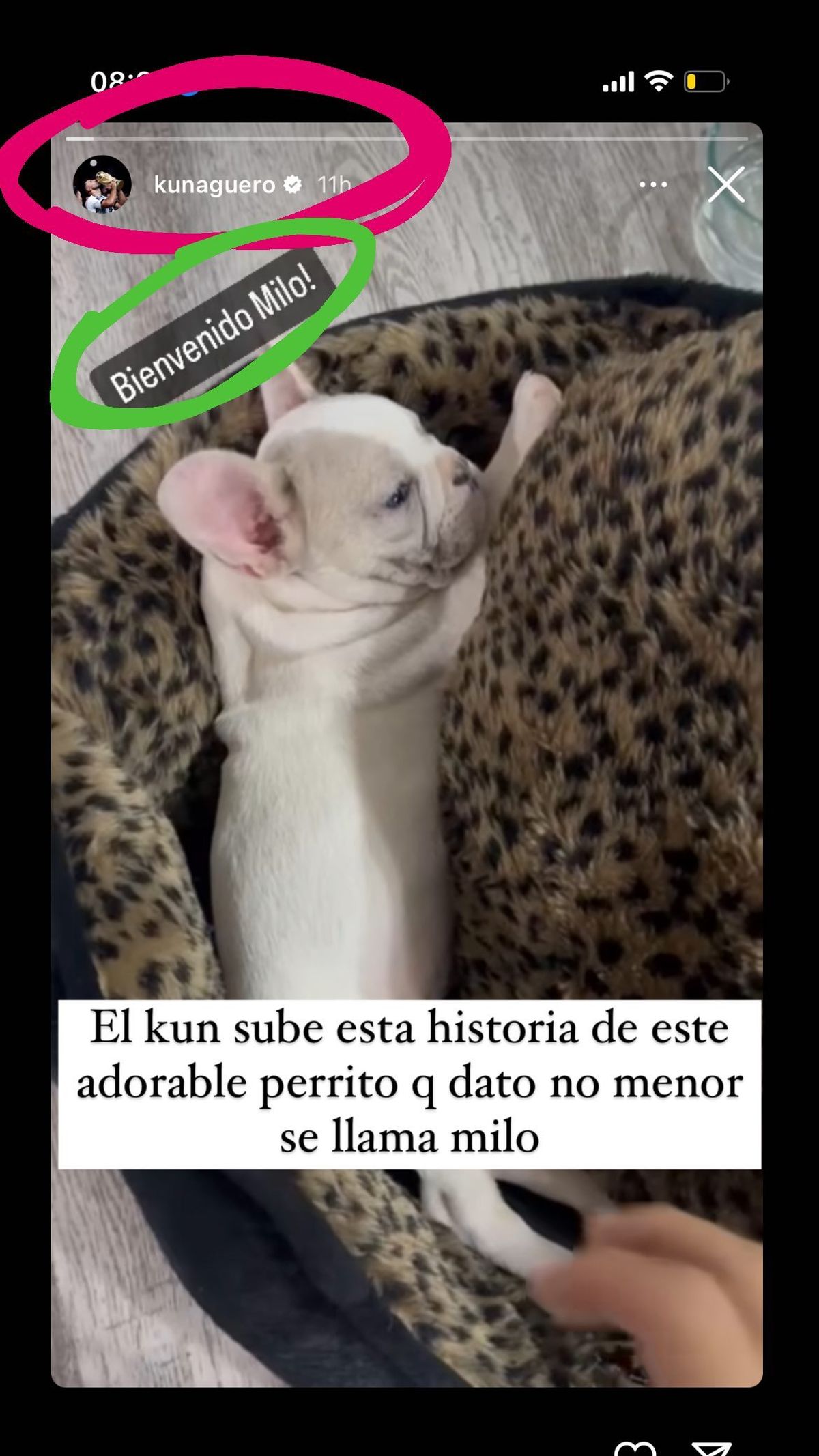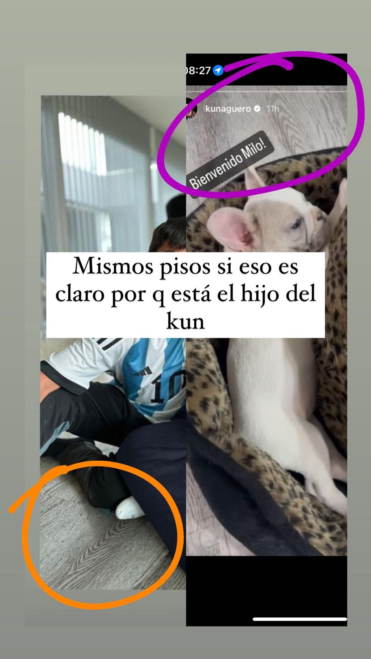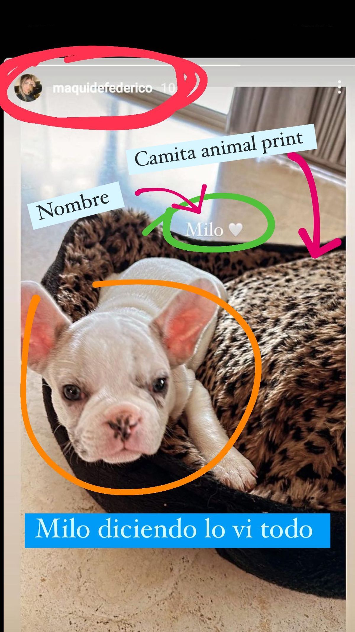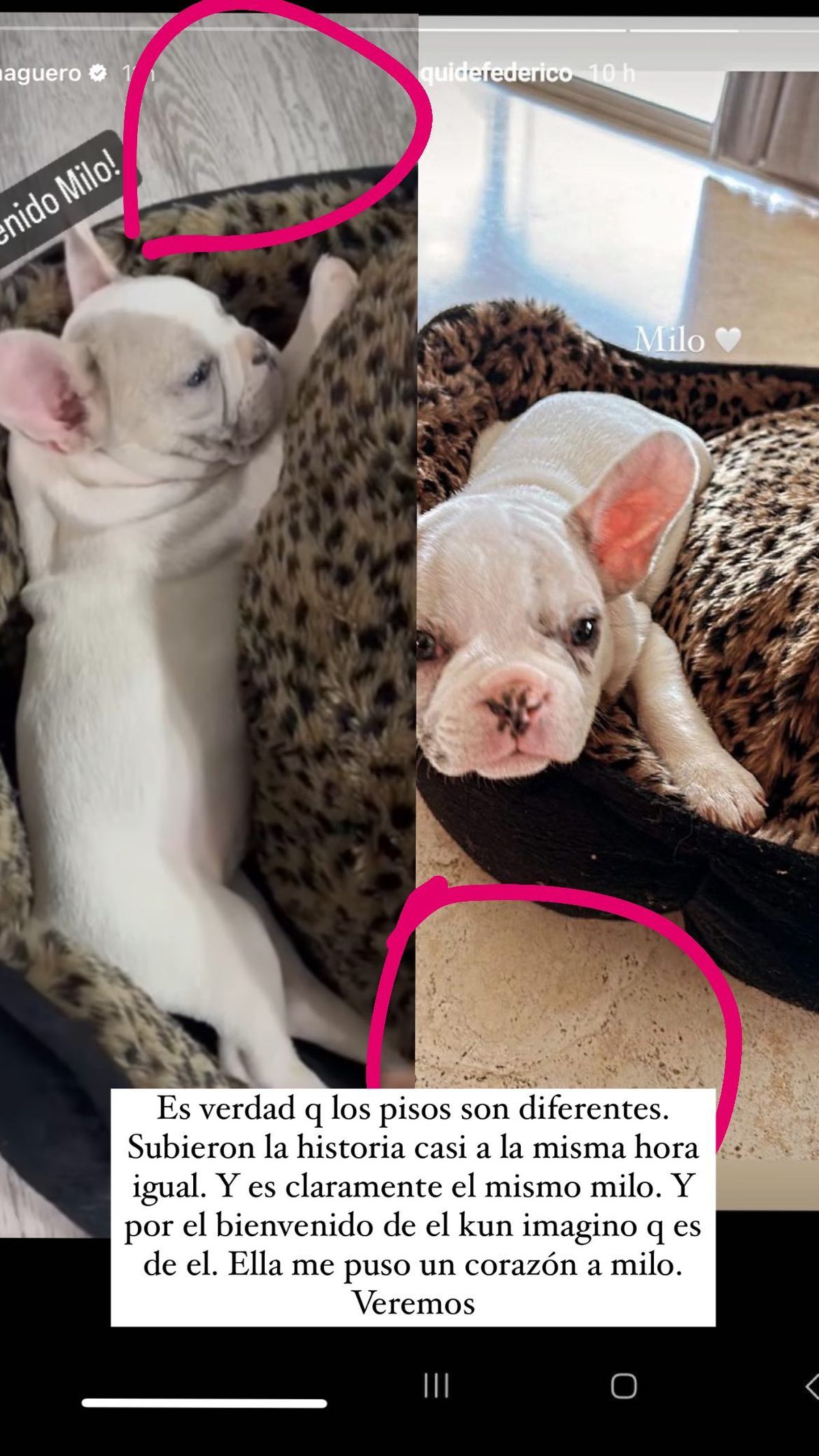 “El Kun sube esta historia de este adorable perrito que, dato no menor, se llama Milo. Hay una chica, hermana de un jugador de fútbol, que sube la mismísima historia con un perrito que se llama Milo, que duerme sobre una cama animal print”, escribió Juariu, quien compartió el perfil de 'Maqui'.