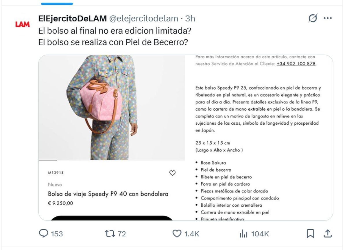 En las últimas horas, desde El Ejército de LAM compartieron información sobre el origen del bolso y destacaron un dato que generó controversia: está confeccionado con piel de becerro. “¿El bolso al final no era edición limitada? ¿El bolso se realiza con Piel de Becerro?”, escribieron en X, dejando abierta la discusión.