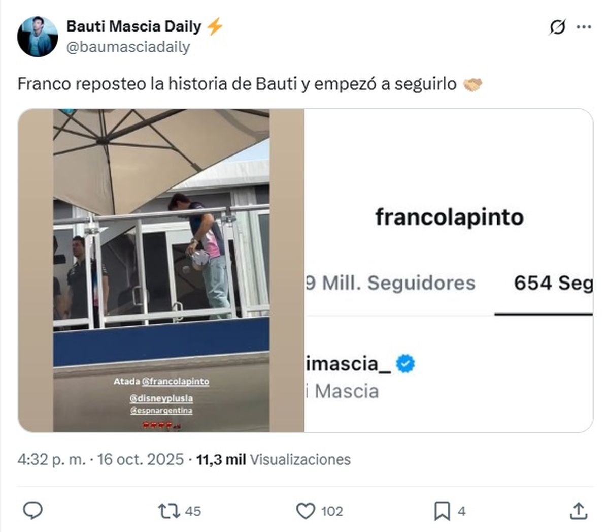 Lo cierto es que según pudo constatarse en el posteo de Bauti en el que publicó varias fotografías y algunos pasajes de videos mientras cruzaba unas palabras con Franco, sus seguidores estallaron de felicidad y en menos de un par de horas el posteo tenía más 35 mil likes.