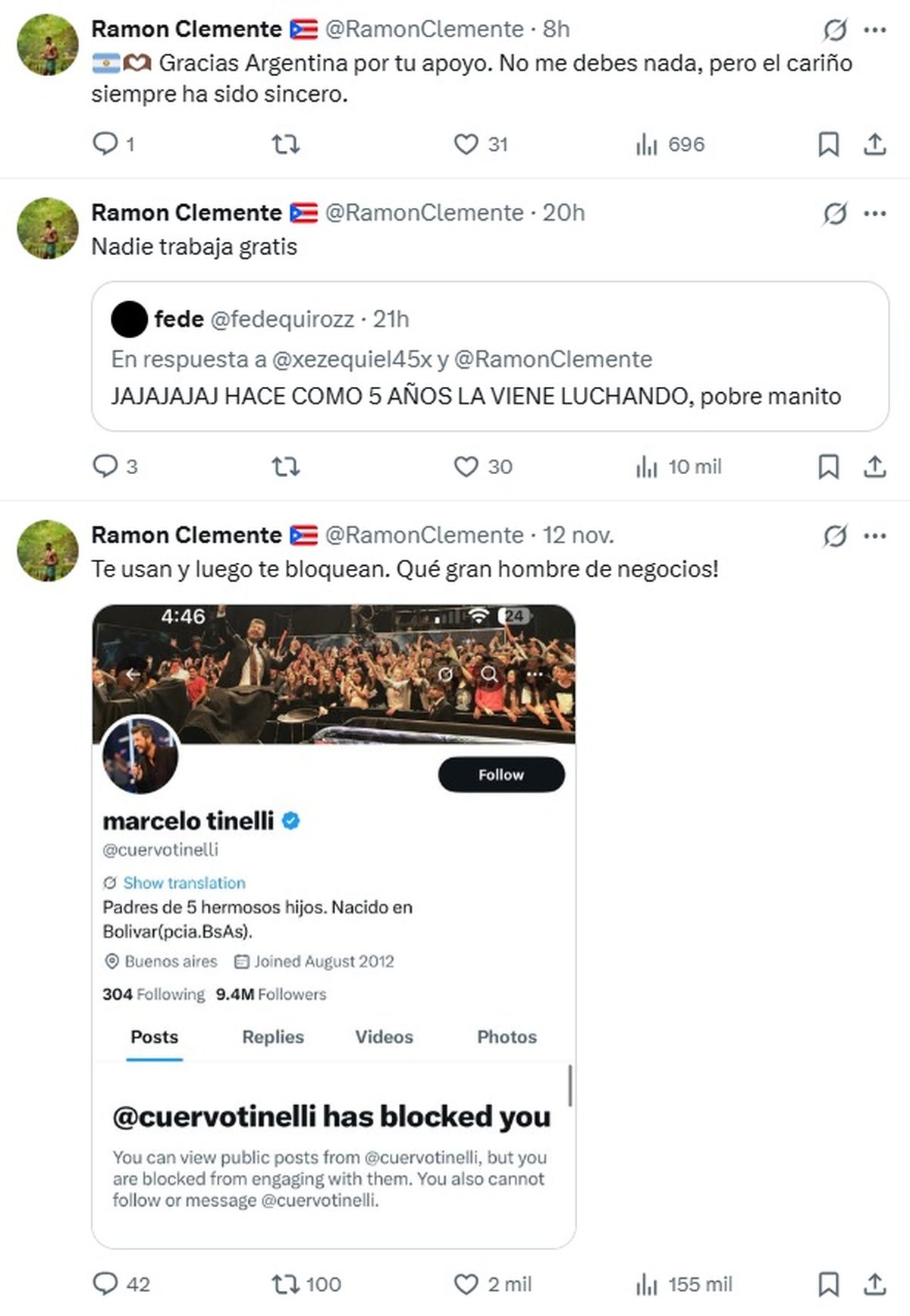 El propio Ramón Clemente expuso la situación nuevamente en las últimas horas a través de su cuenta en X donde apuntó directamente contra Tinelli por la deuda y por bloquearlo de las redes ante su reclamo que ya lleva varios años y separando al club del conflicto.