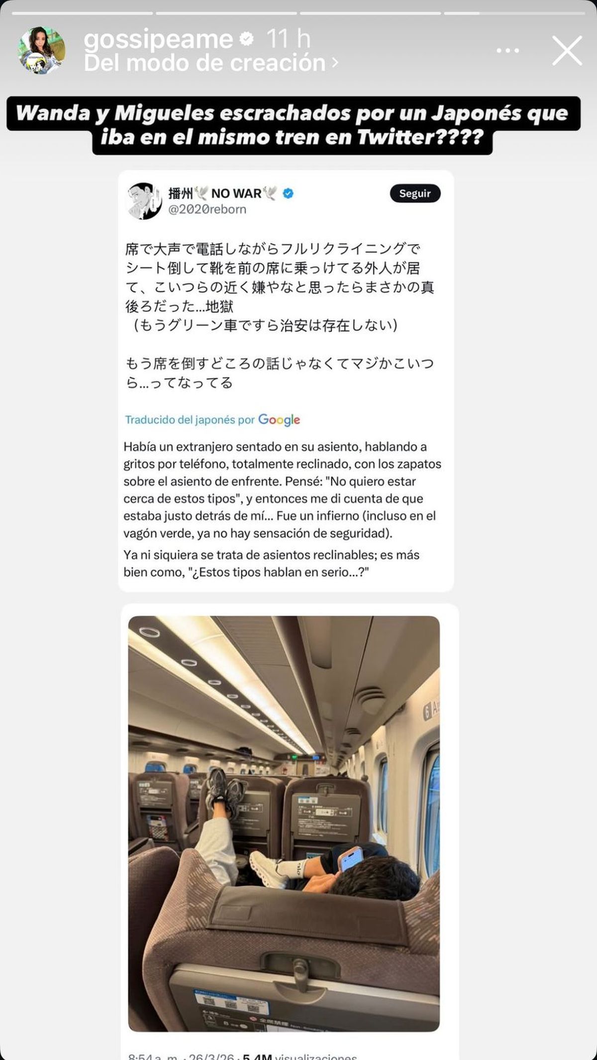 “¿Wanda y Migueles escrachados por un japonés que iba en el mismo tren?”, escribió Pochi al compartir la imagen que desató el revuelo. Aunque en la foto no se distinguen claramente los rostros, varios usuarios en X aseguraron haberlos identificado por detalles como el calzado y la disposición de los asientos, coincidentes con una postal que la propia mediática había subido desde el vagón.