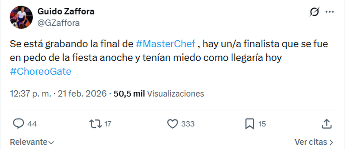 "Se está grabando la final de #MasterChef , hay un/a finalista que se fue en pedo de la fiesta anoche y tenían miedo como llegaría hoy", mencionó Guido Zaffora en su cuenta de X.