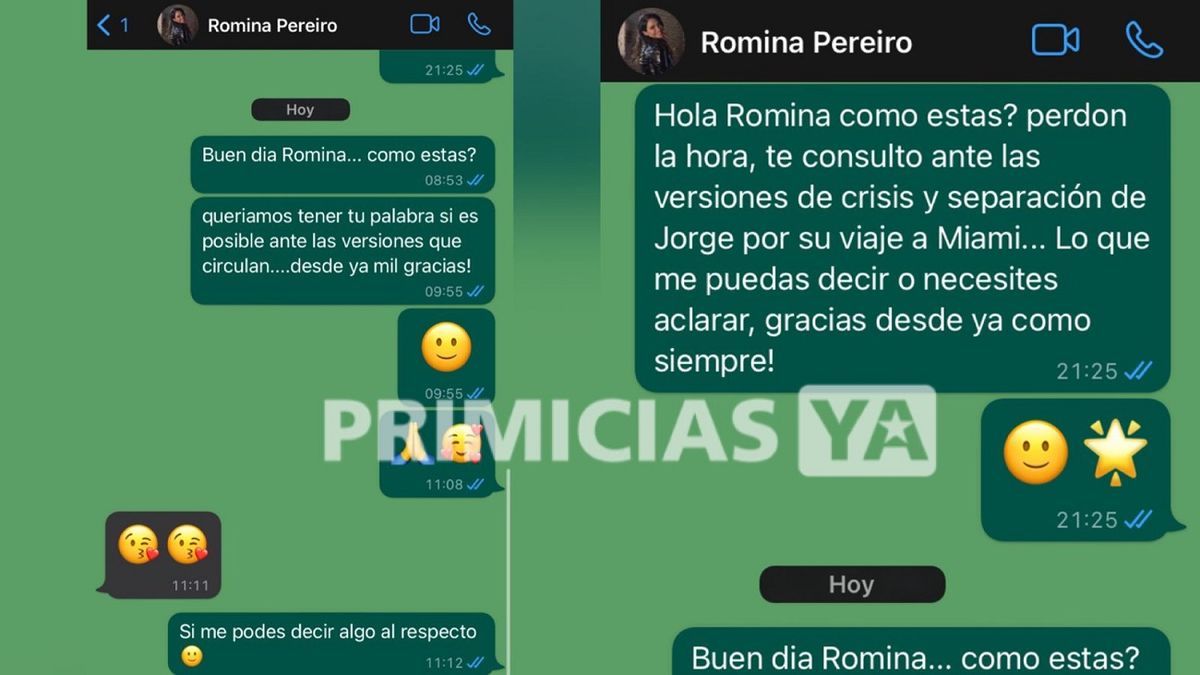 Ante la insistencia para poder obtener su palabra, este jueves Romina respondió simplemente con dos emojis que mandan un beso de corazón. Cabe destacar que Pereiro siempre respondió a todo tipo de consultas que le hizo este medio en respectivas oportunidades, hasta negó otras versiones de crisis, por eso sorprende que ahora no quiera aclarar el rumor de su separación de Rial.