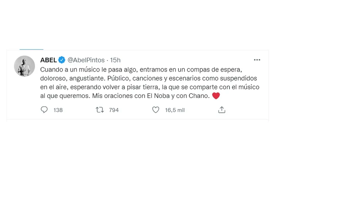 "Cuando a un músico le pasa algo, entramos en un compas de espera, doloroso, angustiante. Público, canciones y escenarios como suspendidos en el aire, esperando volver a pisar tierra, la que se comparte con el músico al que queremos. Mis oraciones con El Noba y con Chano", expresó el cantante.