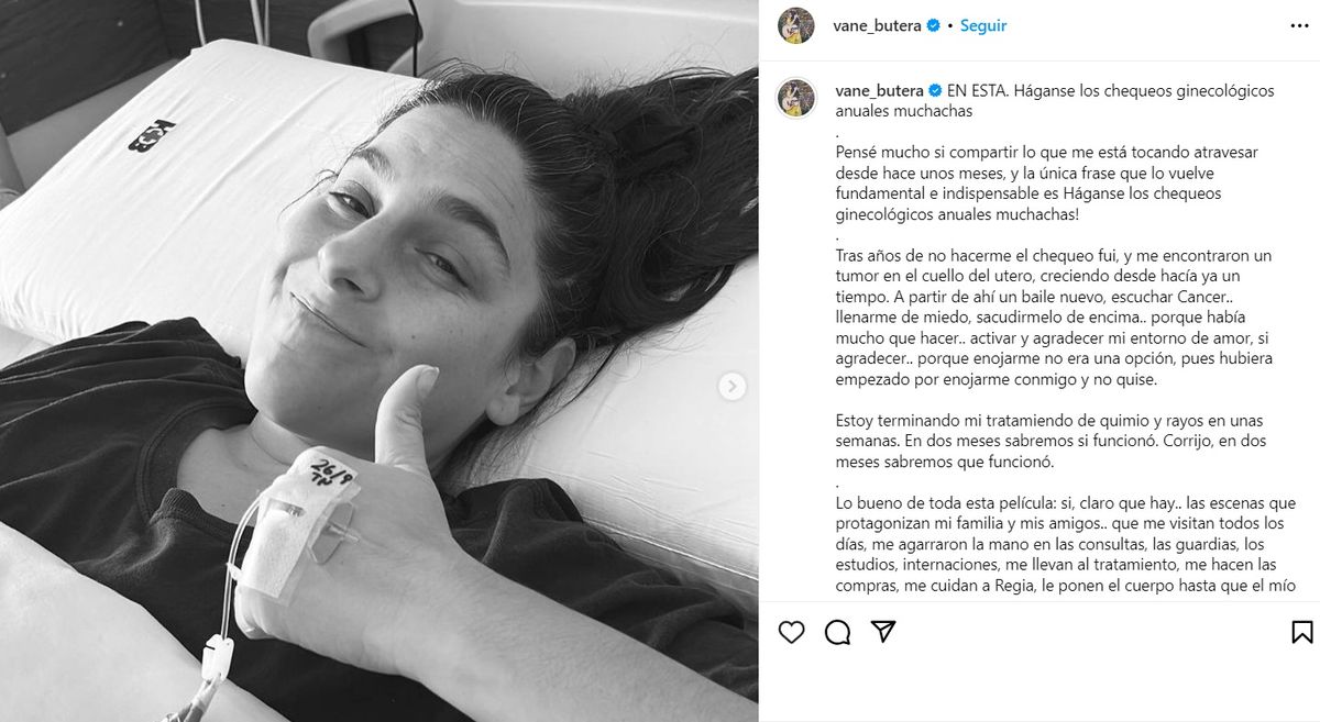"Lo bueno de toda esta película: si, claro que hay... las escenas que protagonizan mi familia y mis amigos.. que me visitan todos los días, me agarraron la mano en las consultas, las guardias, los estudios, internaciones, me llevan al tratamiento, me hacen las compras, me cuidan a Regia, le ponen el cuerpo hasta que el mío esté fuerte otra vez", remarcó Vanesa Butera.