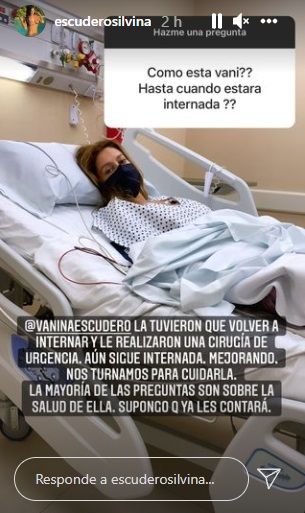 “A Vanina la tuvieron que volver a internar y le realizaron una cirugía de urgencia. Aún sigue internada. Mejorando. Nos turnamos para cuidarla. La mayoría de las preguntas son sobre la salud de ella. Supongo que ya les contará”, escribió Silvina.