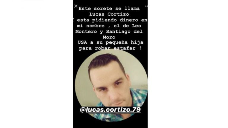 “Este sorete se llama Lucas Cortizo y está pidiendo dinero en mi nombre, el de Leo Montero y el de Santiago del Moro. Usa a su pequeña hija para robar y estafar!”, aseguró la conductora de Cortá por Lozano junto con la fotografía de ese hombre caucásico y de pelo corto que también posee una cuenta en esa misma red social.