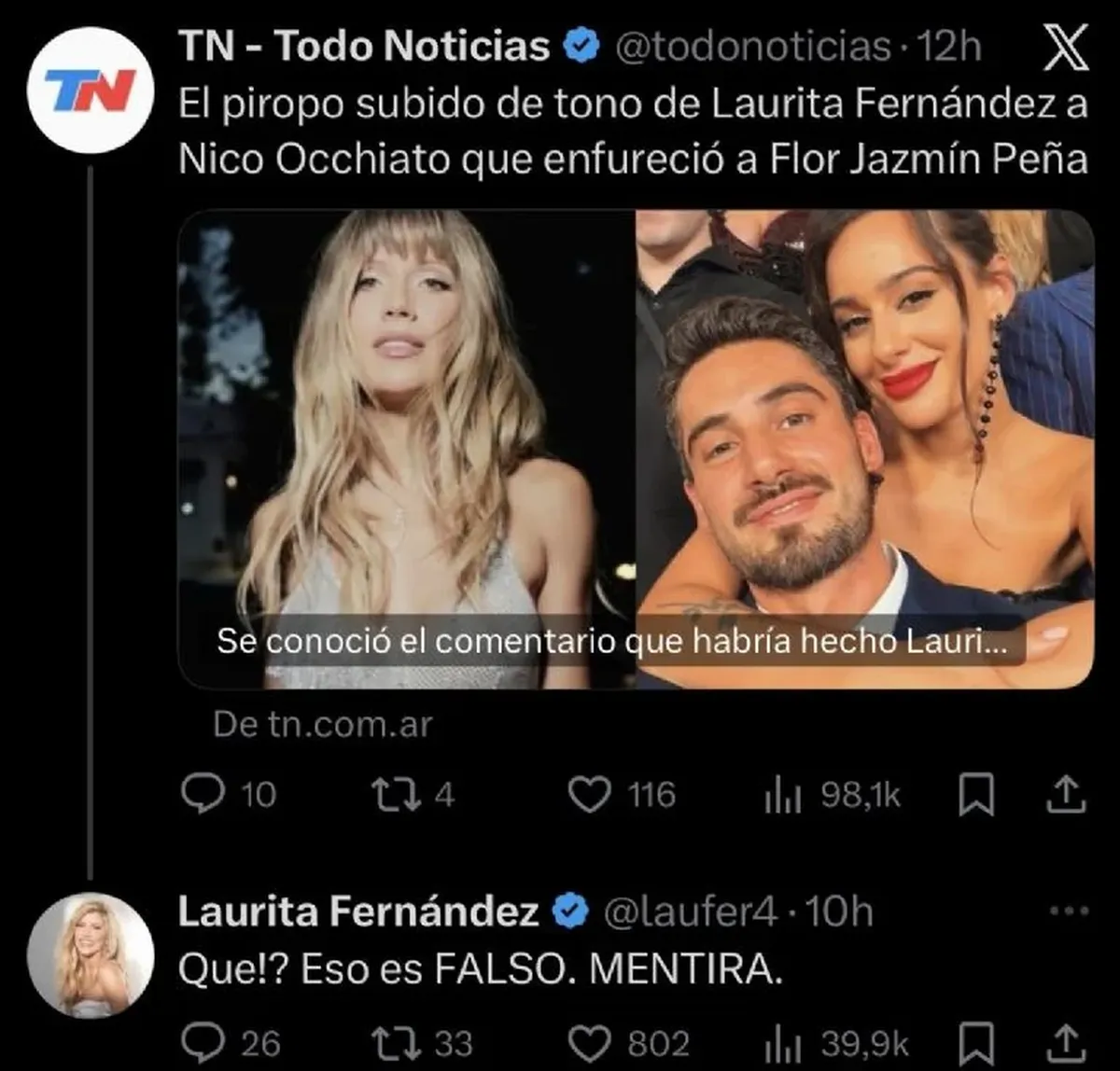 La primera apuntada fue Laurita Fernández, exconductora de Combate, el programa donde Nico Occhiato dio sus primeros pasos en televisión. Según relató la angelita, “Laurita Fernández le dijo a alguien ‘qué bueno que está Nico Occhiato’ y parece que lo escuchó Flor Jazmín”. Sin embargo, la respuesta de Laurita Fernández no tardó en llegar. A través de su cuenta de X, citó una nota de TN titulada “El piropo subido de tono de Laurita Fernández a Nico Occhiato que enfureció a Flor Jazmín Peña” y la negó enfáticamente: “Qué!? Eso es FALSO. MENTIRA”.