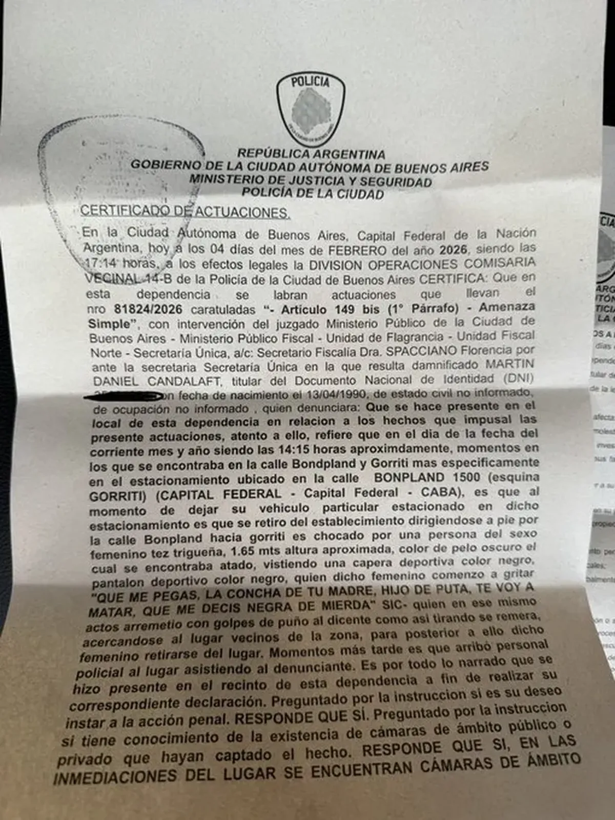 Según consta en la denuncia presentada el 4 de febrero, el hecho ocurrió cerca de las 14:15 en la zona de Bonpland y Gorriti. Candalaft relató que, tras salir de un estacionamiento, una mujer lo corrió, lo insultó y comenzó a golpearlo.