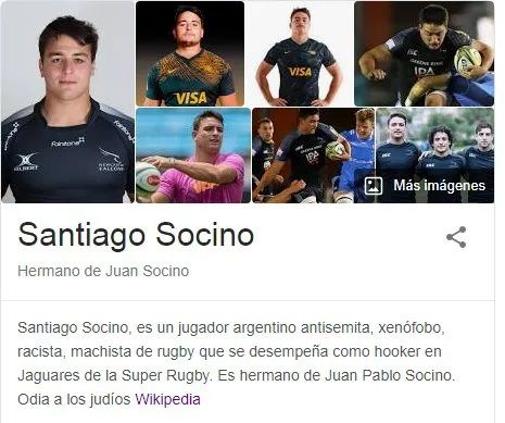 "Santiago Socino, es un jugador argentino antisemita, xenófobo, racista, machista de rugby que se desempeña como hooker en Jaguares de la Super Rugby.​​ Es hermano de Juan Pablo Socino.​ Odia a los judíos" "Quedo hasta la japi después de que fueran develados twitts suyos con contenido altamente racista, xenofobo, machista y misogino".