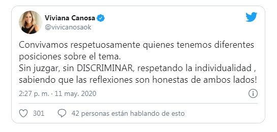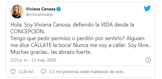 "Hola. Soy Viviana Canosa, defiendo la VIDA desde la CONCEPCIÓN. ¿Tengo que pedir permiso o perdón por sentirlo? Alguien me dice CÁLLATE la boca! Nunca me voy a callar. Soy libre... Muchas gracias.. las abrazo fuerte", replicó la conductora en su redes en una serie de tuits.