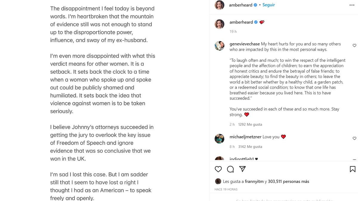 Por último, Amber Heard se refirió a la actitud de los abogados que asistieron a Johnny Depp: “Lograron que el jurado pasara por alto el tema clave de la libertad de expresión e ignorara la evidencia que fue tan concluyente que ganamos en el Reino Unido. Estoy triste porque perdí este caso. Pero estoy aún más triste porque parece que he perdido un derecho que pensé que tenía como estadounidense: hablar libre y abiertamente”.