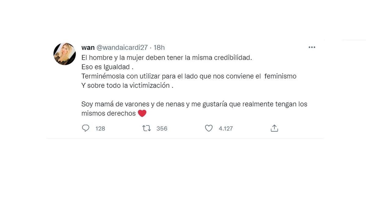 "El hombre y la mujer deben tener la misma credibilidad. Eso es Igualdad. Terminémosla con utilizar para el lado que nos conviene el feminismo y sobre todo la victimización", remarcó la empresaria en Twitter.