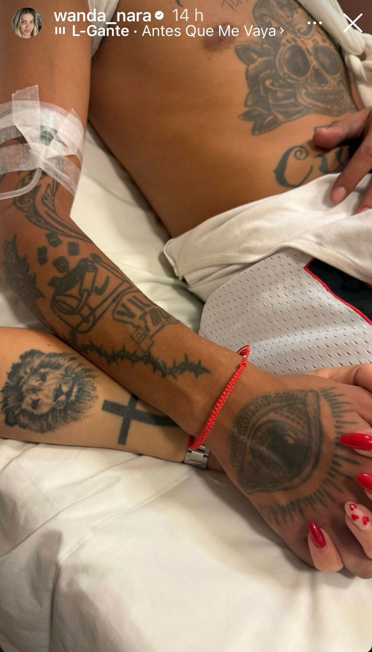 Al tiempo que en el segundo posteo, Wanda compartió una imagen de su mano sosteniendo la de su actual pareja mientras éste era atendido en la camilla del hospital, en la que se escucha de fondo la canción del músico titulada Antes que me vaya.