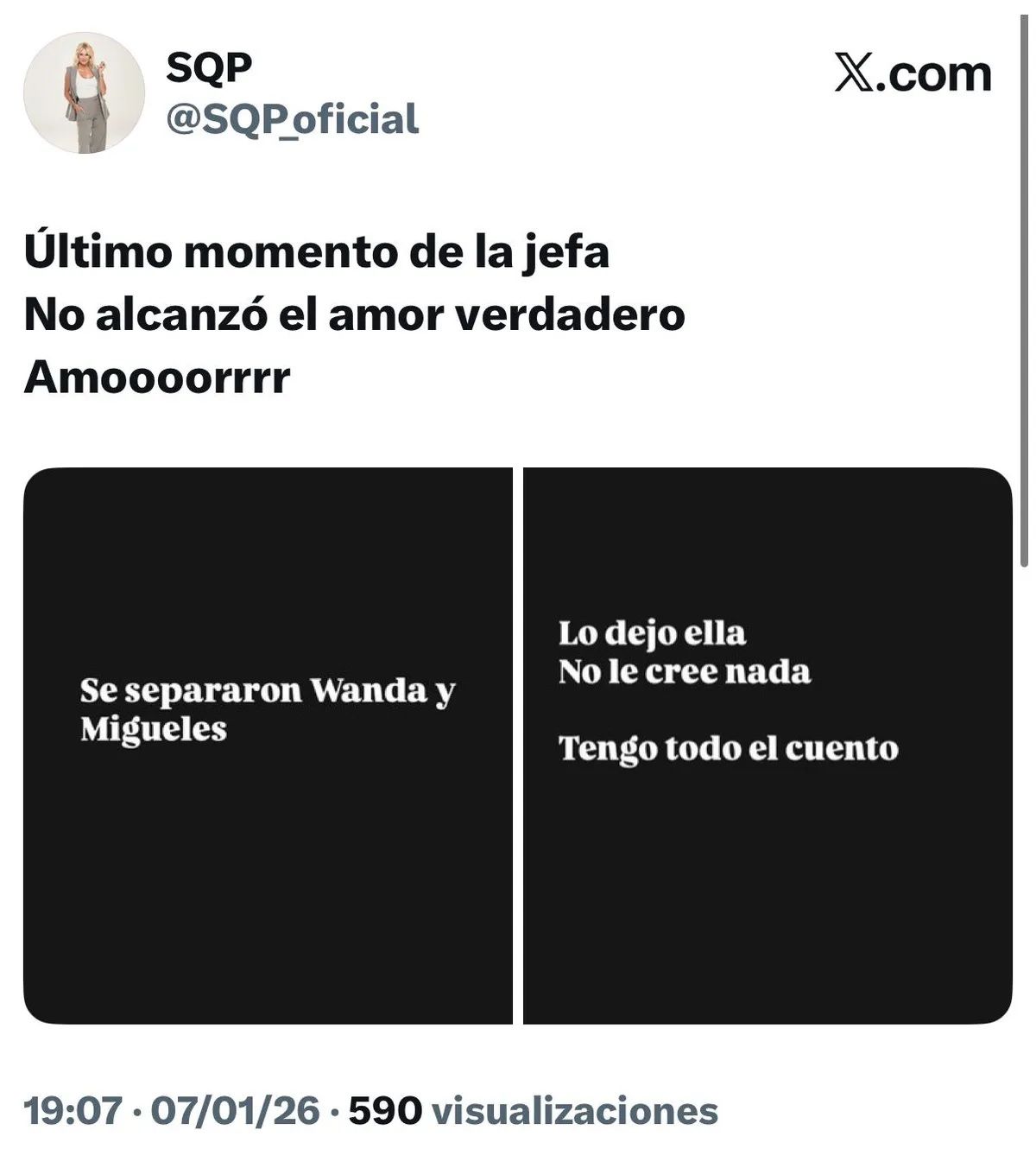 Lejos de quedarse solo con ese enigmático posteo, la panelista decidió ir por más y aportar precisiones sobre lo ocurrido. Minutos después, redobló la apuesta y fue contundente: “Se separaron Wanda y Migueles, lo dejó ella. No le cree nada. Tengo todo el cuento”, lanzó, anticipando que el conflicto tendría nuevas revelaciones y que el trasfondo sería más complejo de lo que parecía.