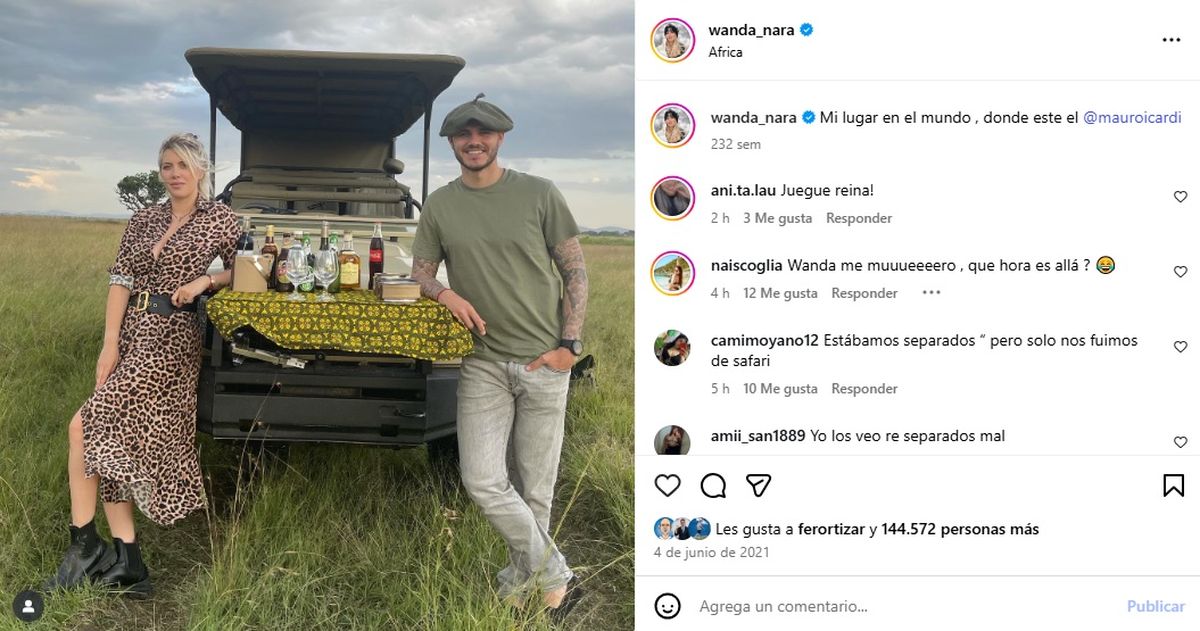 De esta manera, recorriendo el feed de la cuenta oficial de Instagram se pueden ver posteos de junio de 2021 donde fueron de vacaciones a África, a modo de safari romántico. "Mi lugar en el mundo, donde este el @mauroicardi", escribió la mediática junto al padre de sus dos hijas mujeres.