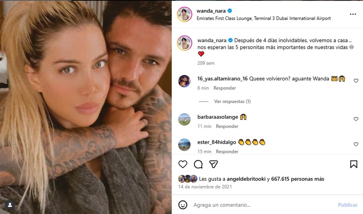 Asimismo, también puede verse otro posteo del 14 noviembre de ese mismo año -ya pasado el Wandagate en el mes de octubre-, donde se los puede ver abrazados luego de una mini escapada romántica a Dubai. “Después de 4 días inolvidables, volvemos a casa... Nos esperan las 5 personitas más importantes de nuestras vidas”, posteó por aquel entonces.