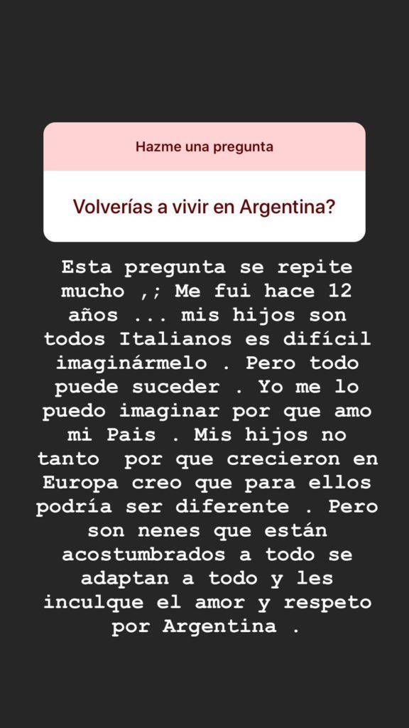 Sin embargo, cambiando rotundamente de tema, la pregunta que más le llegó a Nara fue si volvería a vivir a Argentina, y sincera, respondió: “Esta pregunta se repite mucho. Me fui hace 12 años, mis hijos son todos italianos, es difícil imaginármelo. Pero todo puede suceder. Yo me lo puedo imaginar porque amo a mi país. Mis hijos no tanto porque crecieron en Europa pero creo que para ellos podría ser diferente. Pero son nenes que están acostumbrados a todo, se adaptan a todo y les inculqué el amor y respeto por Argentina”.