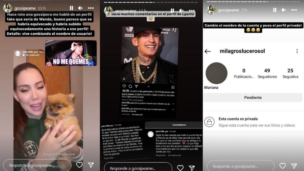Pochi, de Gossipeame, dijo horas antes que el perfil falso había hecho comentarios en la cuenta de L-Gante donde escribió: "Ojalá te des cuenta de todo el dolor que le hiciste sentir a Wanda" y "Tamara Báez debería entender que él se enamoró de Wanda".