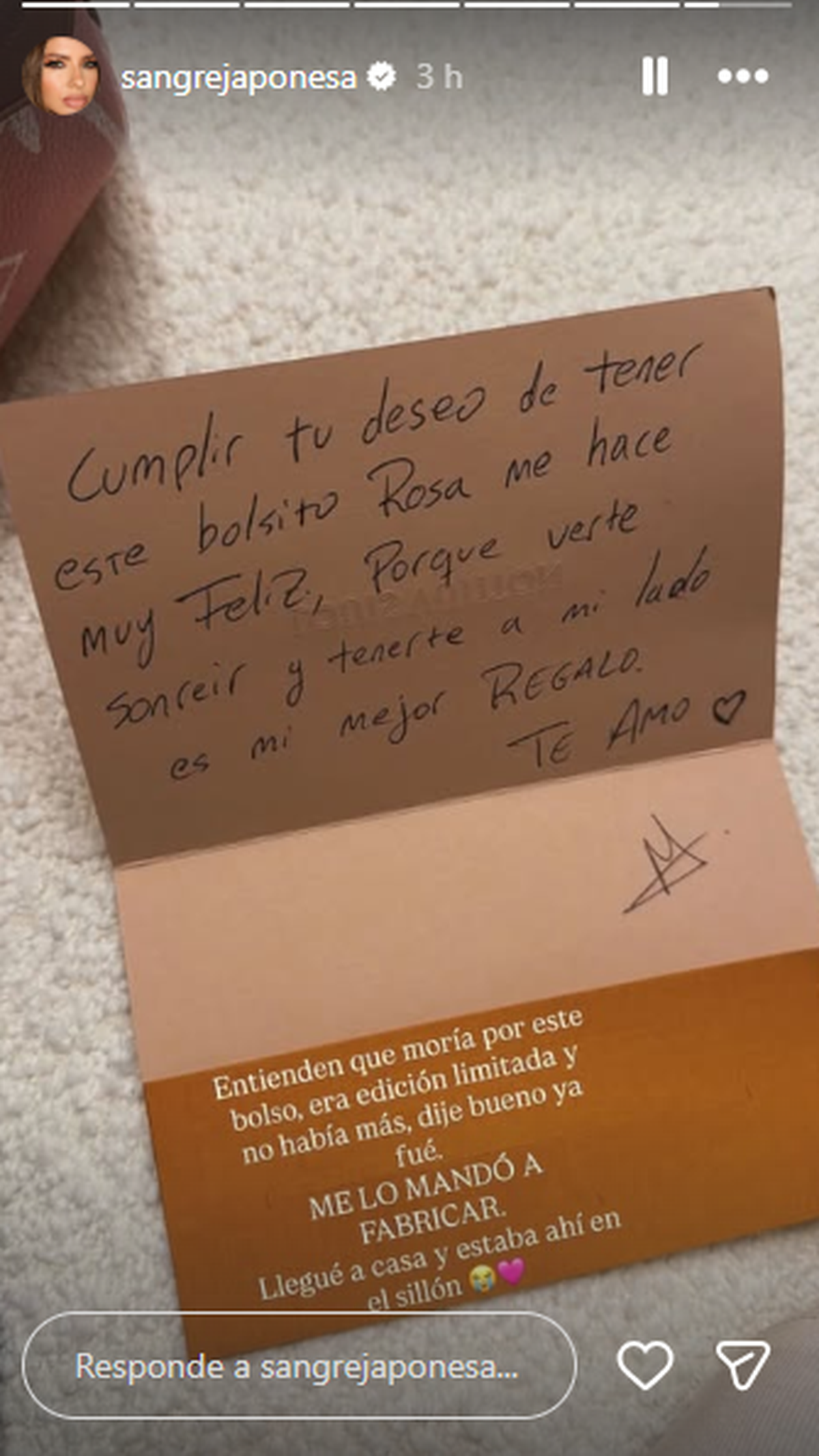 Pero la sorpresa no terminó ahí. Luego de mostrar el exclusivo bolso que recibió, la actriz compartió con sus seguidores el detalle más tierno del gesto: una carta escrita a mano, con un mensaje cargado de romanticismo.