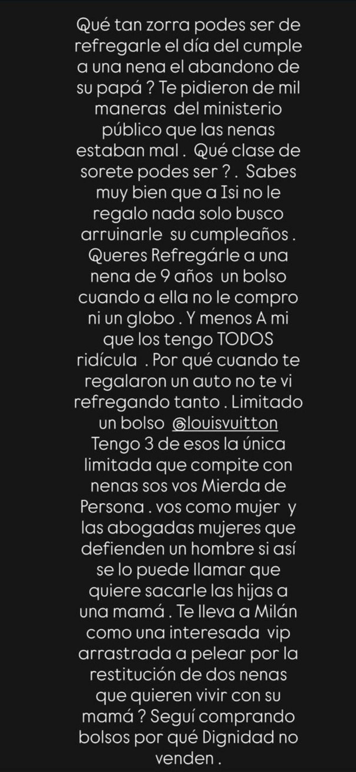 La empresaria redobló la apuesta y siguió su relato sobre el 'bolsogate' todavía más contundente: “Sabés muy bien que a Isi no le regaló nada y solo buscó arruinarle su cumpleaños. Querés refregarle a una nena de 9 años un bolso cuando a ella no le compró ni un globo. Y menos a mí, que los tengo todos, ridícula. Cuando te regalaron un auto no te vi refregando tanto”.
