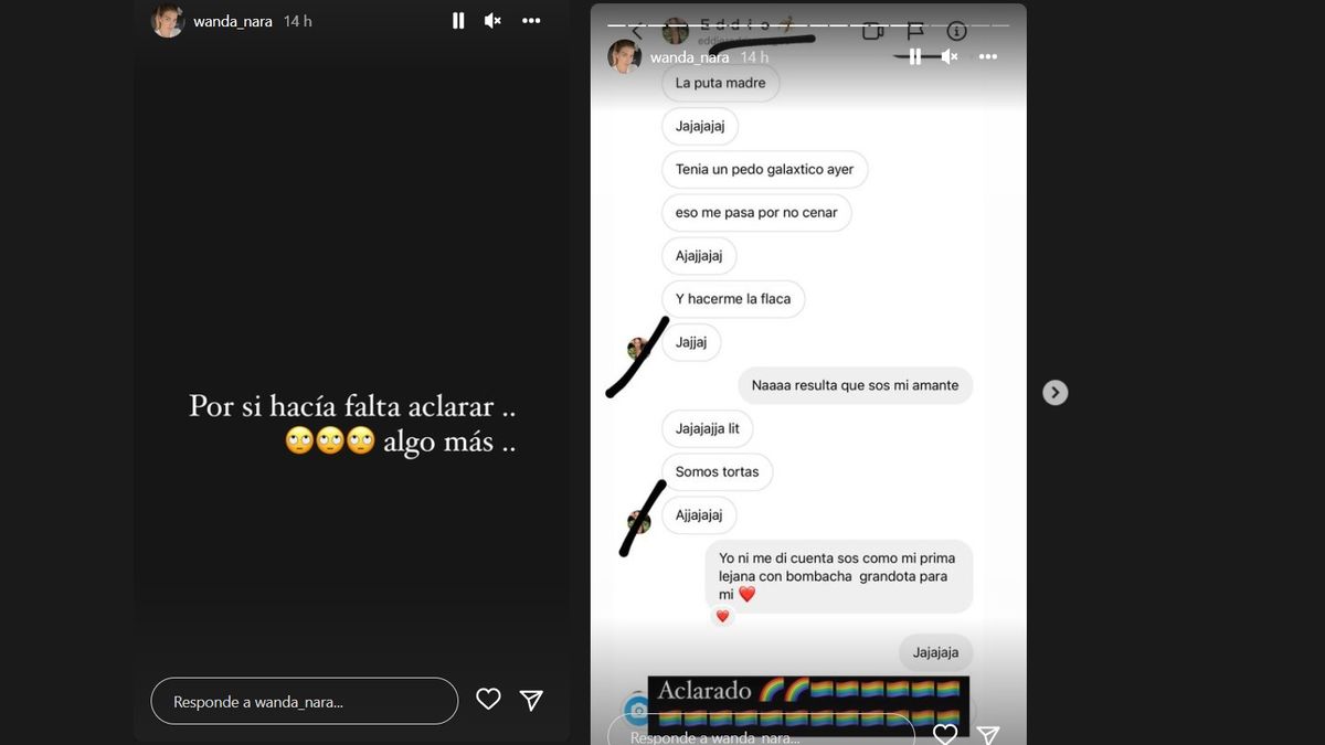 "Ja, ja, ja, literal... Somos tortas", suma él. "Yo no me di cuenta, sos como mi prima lejana con bombacha grandota para mí", le contesta Wanda en broma. Y cerró el tema: "Por si hacía falta aclarar algo más...".