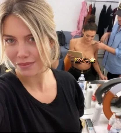 Entre las imágenes que compartió apareció una selfie suya en maquillaje en la que, de fondo, se ve a la conductora Giorgia Venturini con los pechos desnudos.