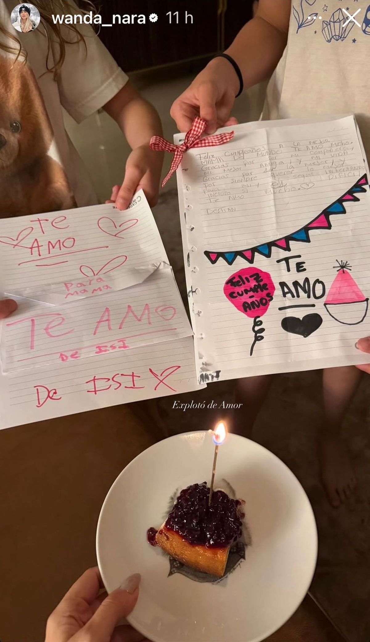 Así, en los primeros minutos del día la rubia mostró en sus Instagram Stories las sorpresas que sus hijas mujeres -fruto de su relación con Mauro Icardi- le prepararon para este día tan especial. Con una pequeña torta casera y dos cartas a mano, las nenas emocionaron por completo a su mamá.