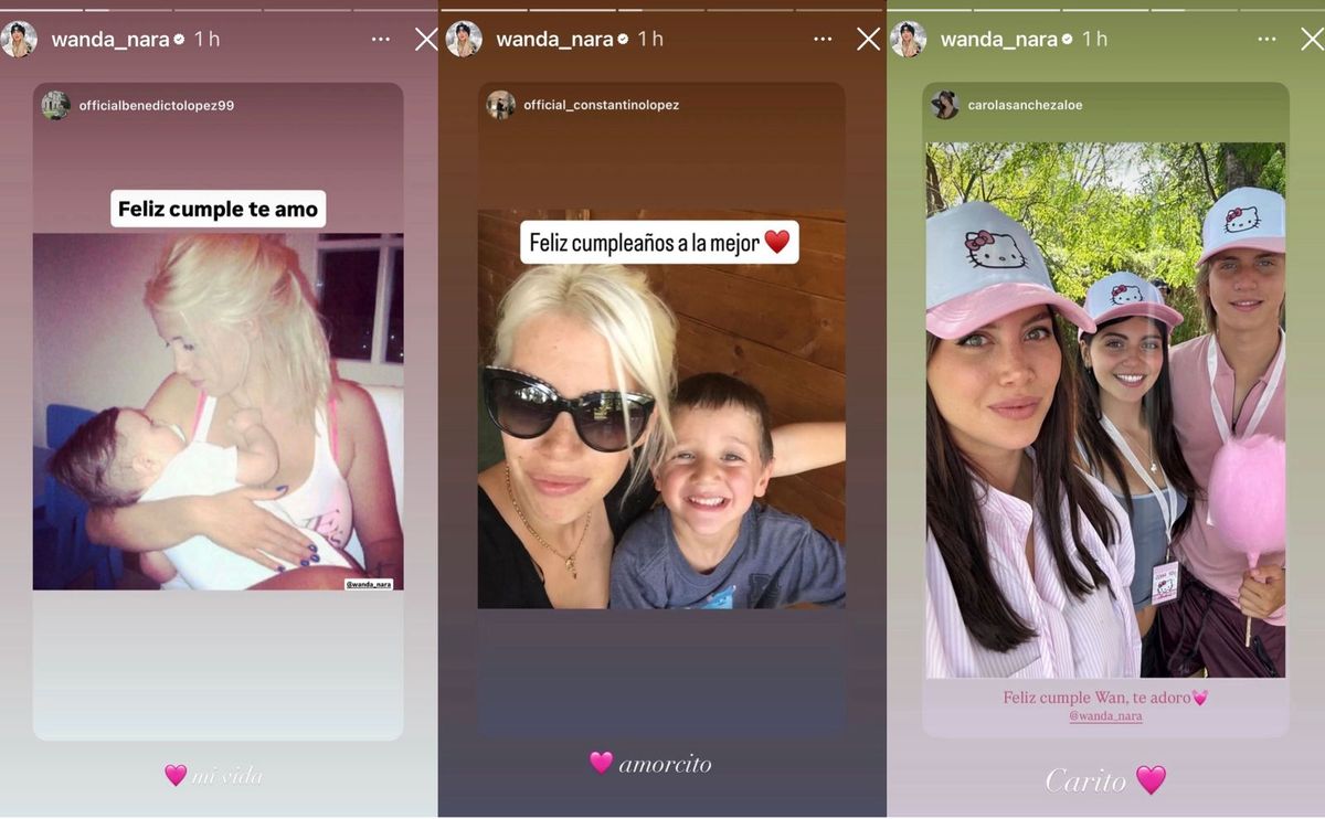 Claro que los varones tampoco se quedaron atrás, y ya más grandes ellos, optaron por saludarla a través de tres historias virtuales por separado. Mientras que Benedicto optó por publicar una postal de él en brazos de su mamá, le dedicó un "Feliz cumple te amo"; Constantino compartió una selfie suya de pequeño junto a Nara, a la que le escribió "Feliz cumpleaños a la mejor", al tiempo que por el lado Valentino, fue su novia Carola Sánchez Aloe la encargada de subir un postal junto al adolescente y su famosa madre bajo el saludo "Feliz cumple Wan, te adoro".