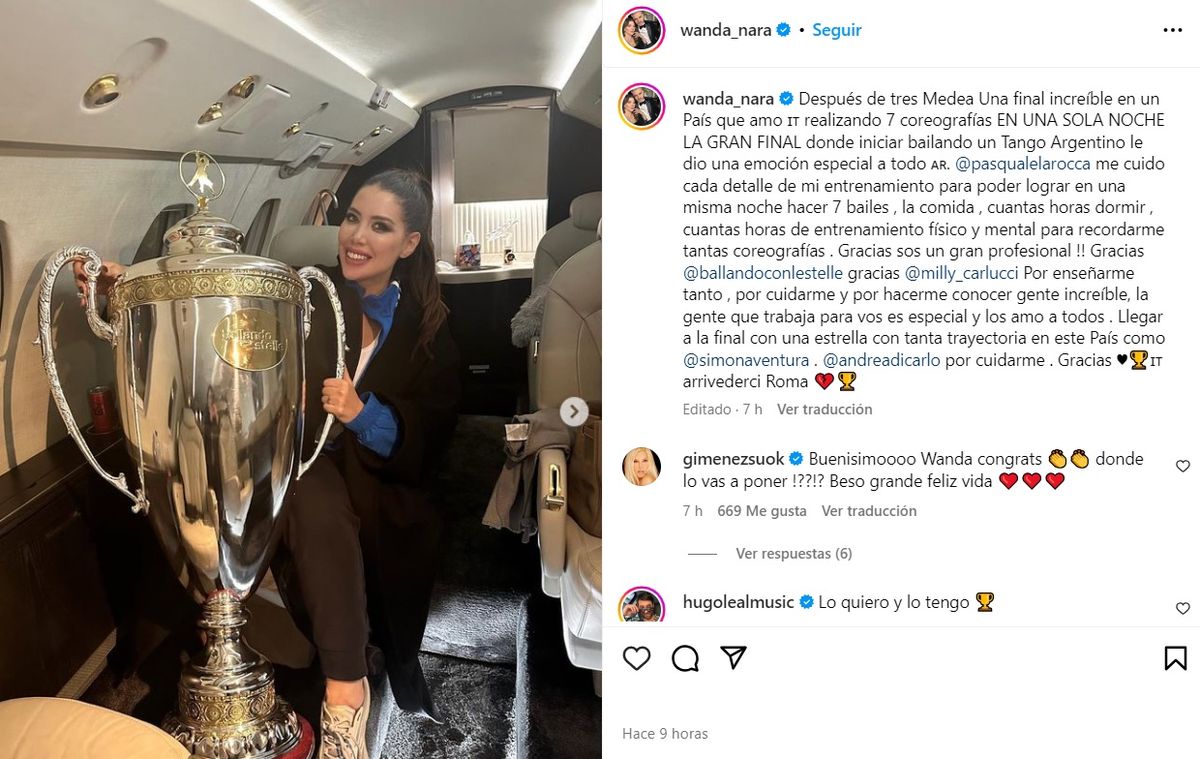 "Después de tres horas una final increíble en un país que amo, realizando 7 coreografías en una sola noche, la gran final donde iniciar bailando un Tango Argentino le dio una emoción especial a todo", comenzó su posteo.