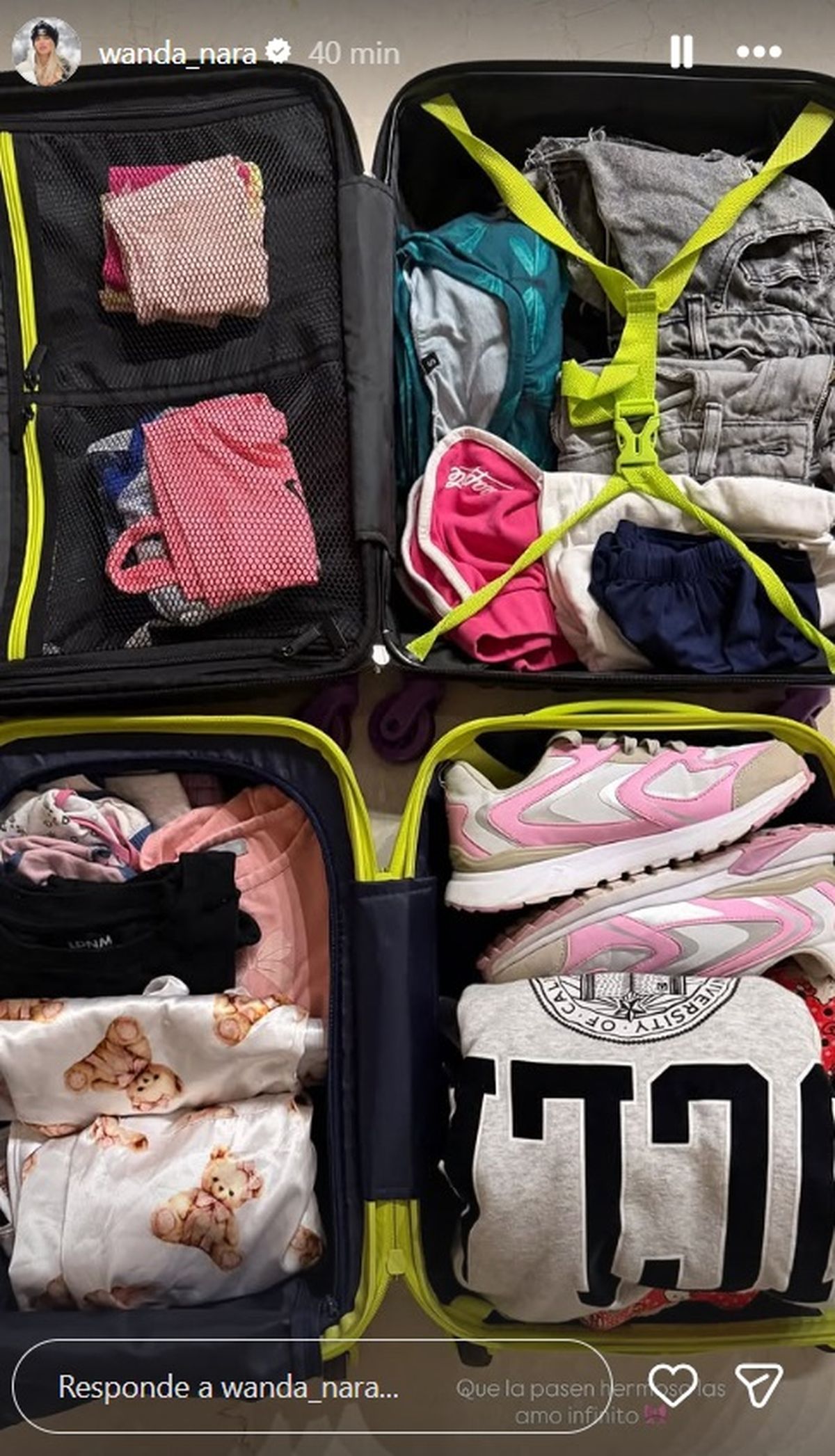 Lo cierto es que antes de llevar a sus hijas al colegio, donde luego serán retiradas por el futbolista, Wanda Nara mostró una imagen en las redes muy siginificativa que tiene que ver con las valijas con ropa que preparó especialmente para que las niñas pasen los próximos días en la casa del papá.